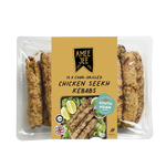 Amee Jee Chicken Seekh Kebabs are juicy, smoky, char-grilled chicken kebabs made with 80% seasoned chicken, fresh herbs, and aromatic spices. Prepared using a traditional South Asian recipe, these kebabs deliver rich flavour and a tender texture with an authentic grilled finish.